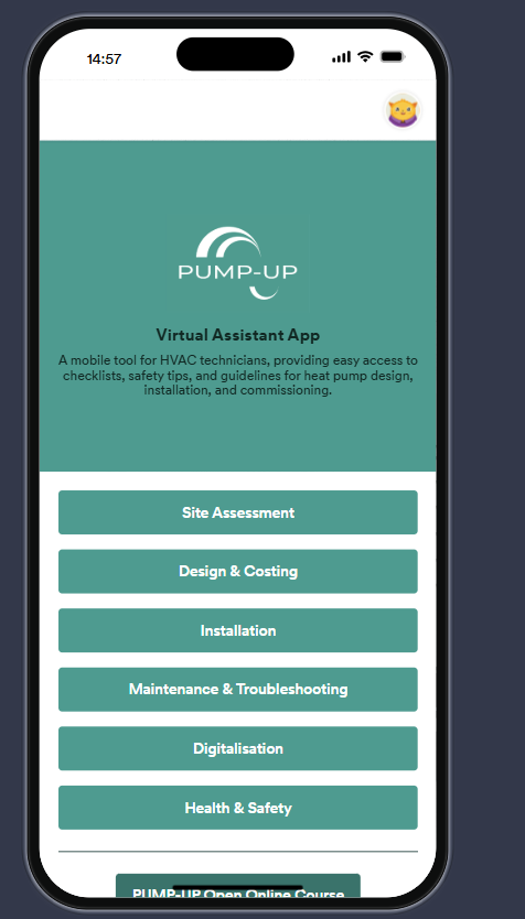 Le projet PUMP-UP a le plaisir d’annoncer le lancement de l’application Assistant virtuel PUMP-UP, un outil numérique pratique conçu pour accompagner les techniciens CVC et les apprenants travaillant avec des systèmes de pompes à chaleur.