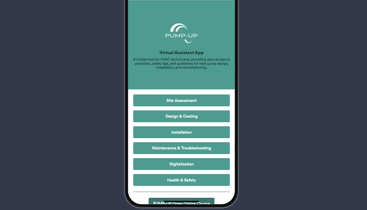 PUMP-UP-projektil on hea meel teatada PUMP-UP-i virtuaalse assistendi rakenduse käivitamisest. See on praktiline digitaalne tööriist, mis on loodud soojuspumbasüsteemidega töötavate HVAC-tehnikute ja praktikantide toetamiseks.
